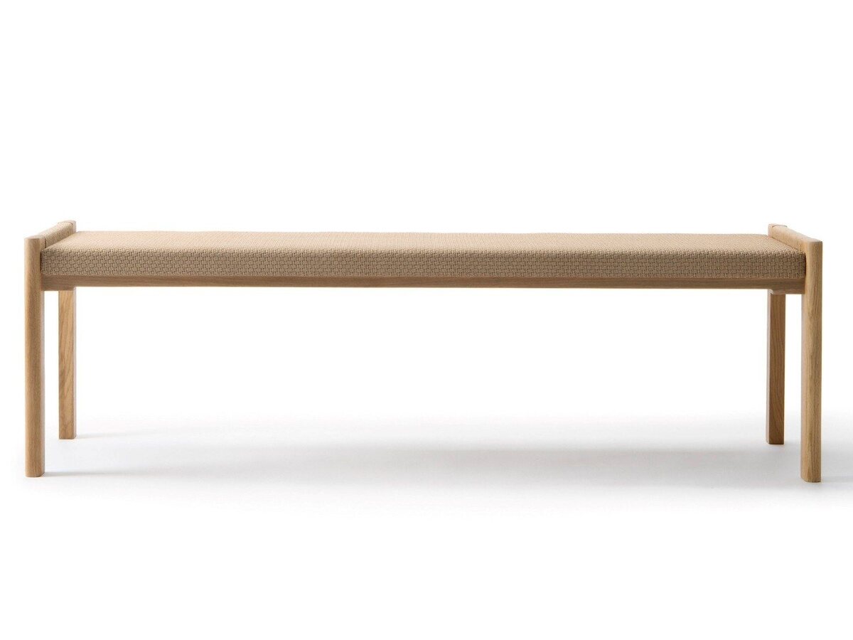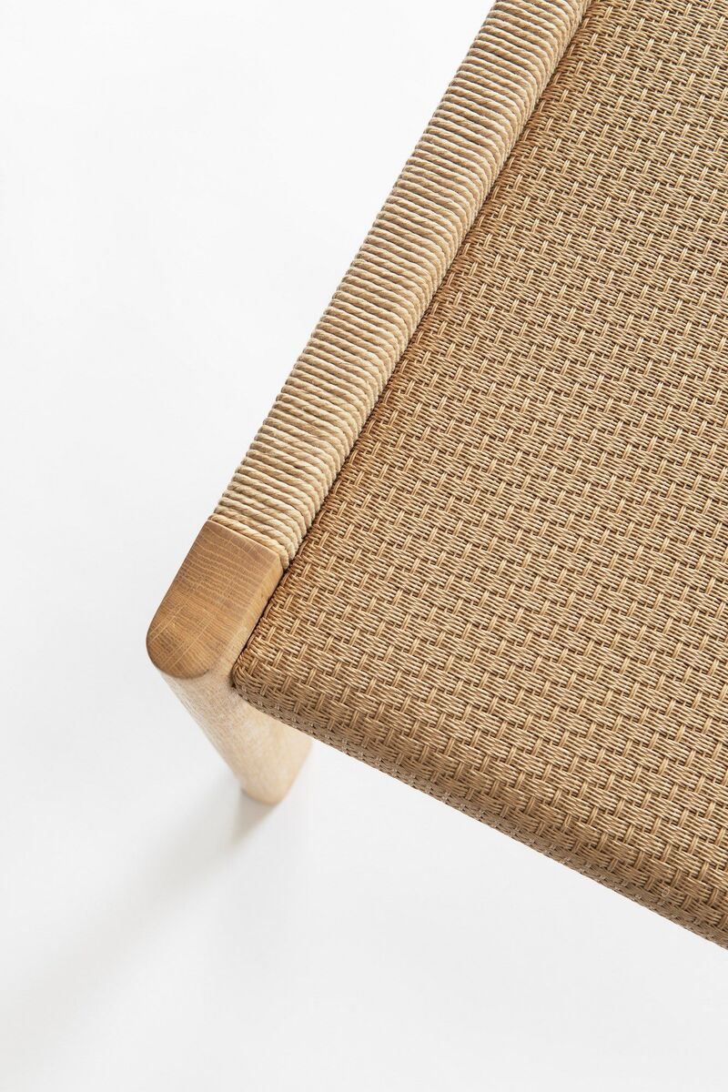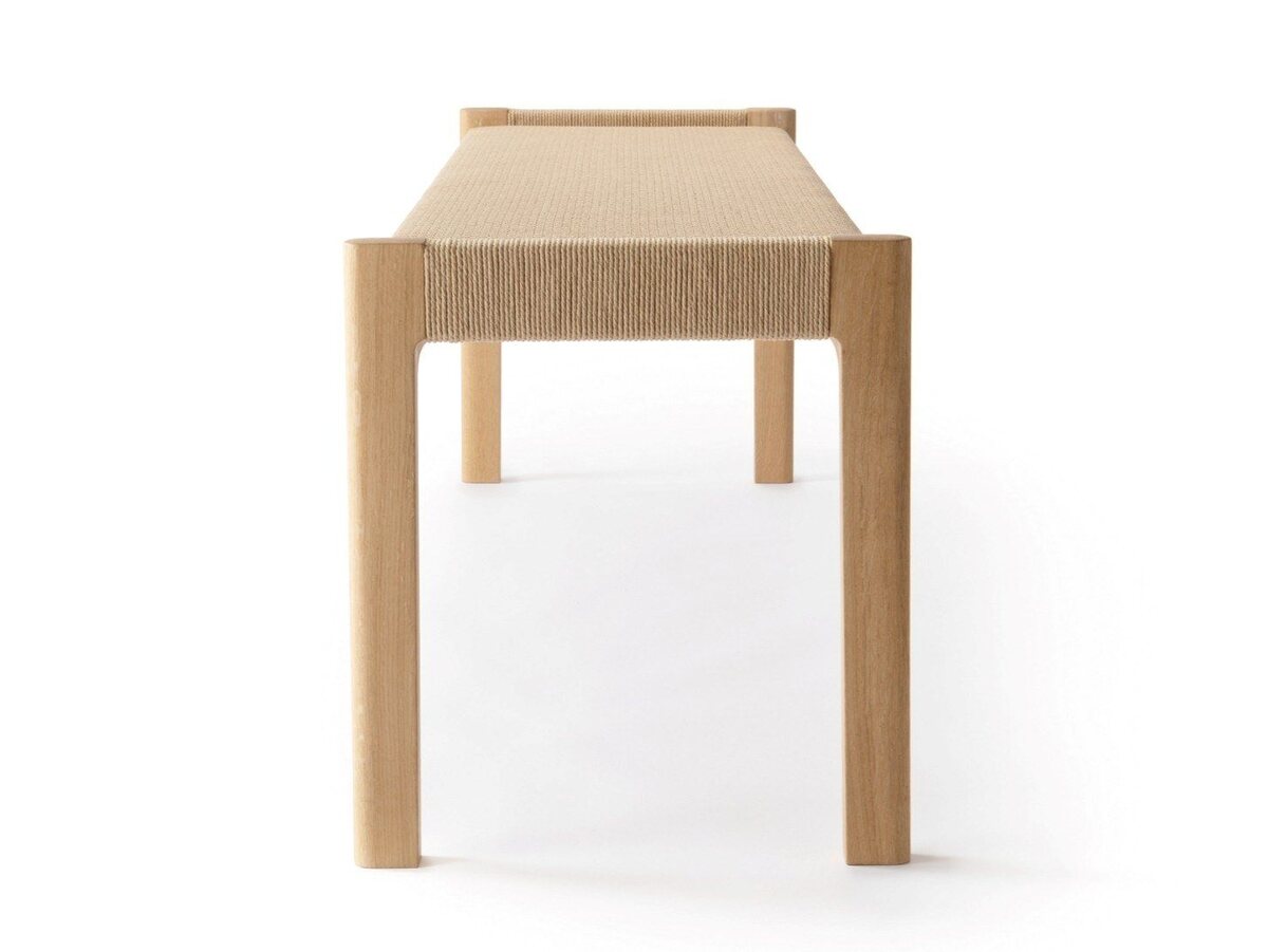 A handcrafted oak bench with paper yarn upholstery, blending traditional Finnish craftsmanship with modern design.